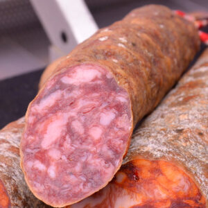 Elaborado con carne y grasa de cerdo troceada y finamente condimentada, sometida a un proceso minucioso de maduración, se distingue por su intenso sabor, su
